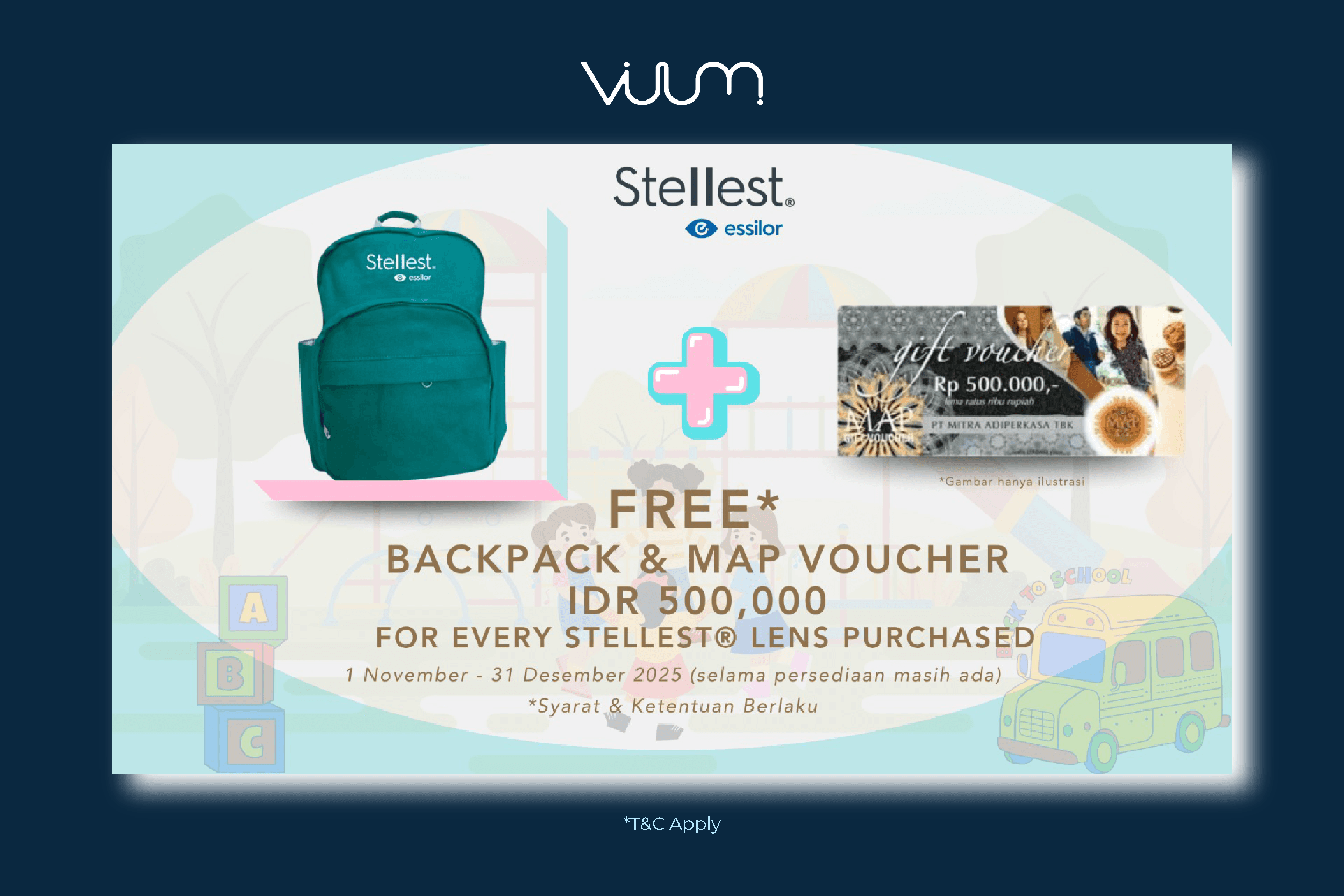 Dapatkan GRATIS tas dan vocuher MAP senilai Rp 500.000,- setiap pembelian frame dengan lensa Stellest® dari Essilor